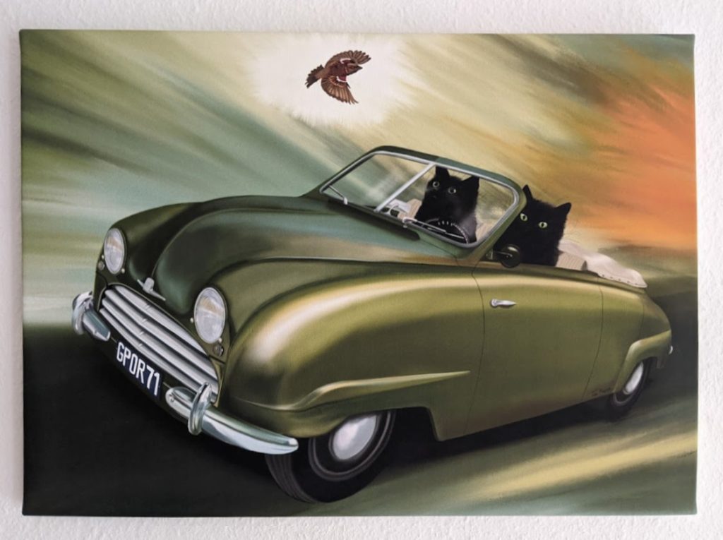 “Heel blij met dit geweldige werk van Tim Hupkes, met onze twee katers in een Saab 92 🙂”