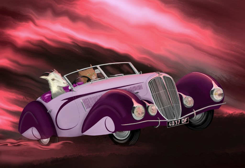Zo biedt Tim Hupkes Art in beperkte oplagen (!) giclées aan van haar bijzondere dieren in auto. Het zijn niet zomaar dieren en het zijn al zeker niet zomaar auto’s. Toen Tim de eerste keer haar Delahaye Torpedo 135 MS uit 1938 toonde met geit en kat was ik verkocht. Ik heb jarenlang enkele geiten gehad en ooit, in een ver verleden, nam ik een rooie kat in huis omdat ik niet wilde dat hij zou worden verdronken. De combinatie met een paarse Delahaye Torpedo waarbij ik ook nog zelf de nummerplaat mocht bedenken was uniek. Het werd het kanton in Frankrijk waar ik volgens Facebook woon (en wat best wel een leuk stadje is, je ziet die auto daar meteen toeren!), gecombineerd met m’n eerste eigen telefoonnummer.